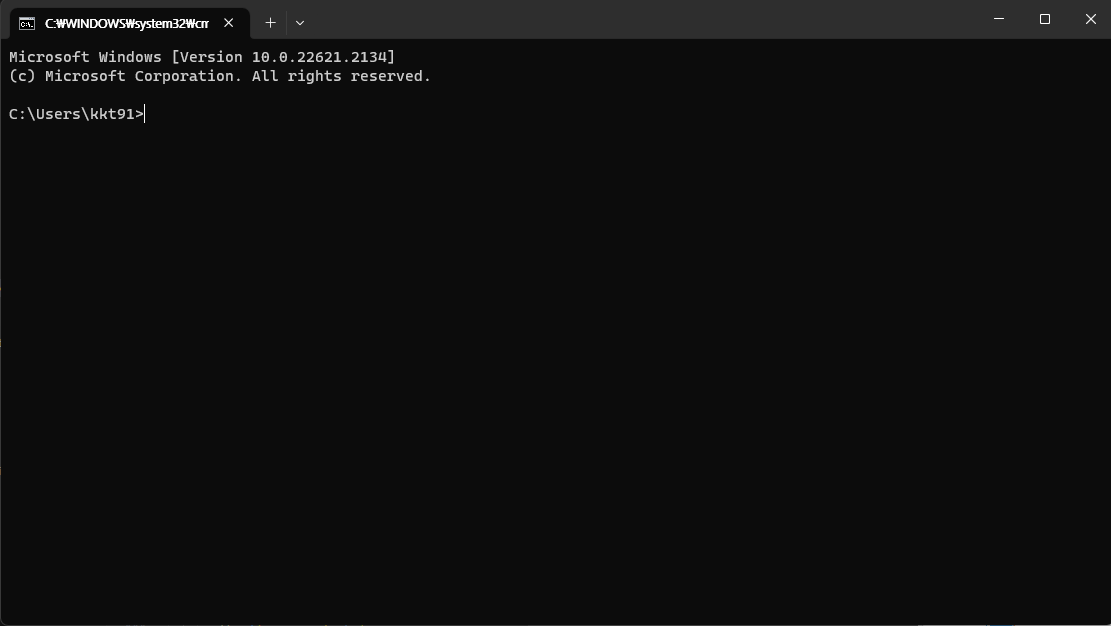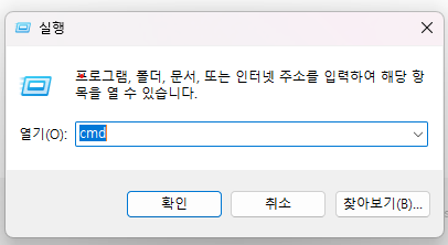 - 먼저 Win + R 을 눌러서 실행 창을 열어준 후 cmd 를 입력해 명령 프롬포트를 실행합니다.