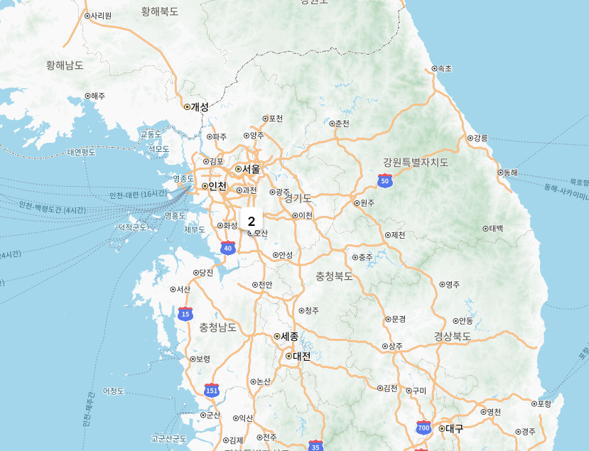 해당 코드가 실행 되면 아래와 같이 지도 레벨에 따라 클러스터와 마커가 표시됩니다.