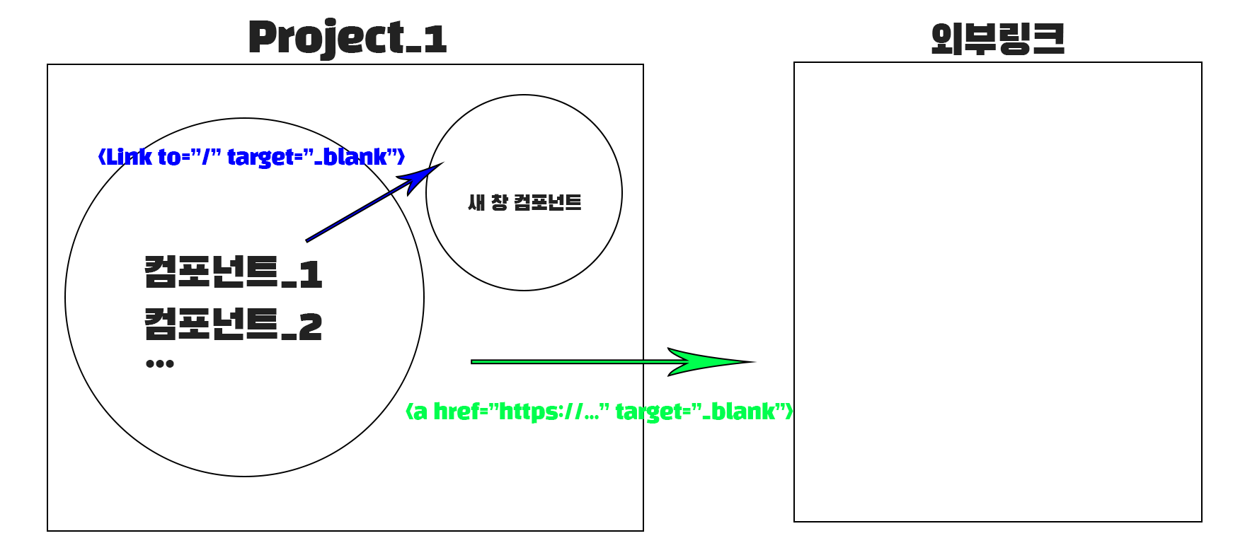 혼자 공부할 때 너무 어렵게 생각해서인지… 무튼 저 방법을 사용하면 프로젝트 내 컴포넌트를 새창으로 불러올 수 있었습니다.// 컴포넌트 새 창(탭) 열기 <Link to="/" target="_blank">